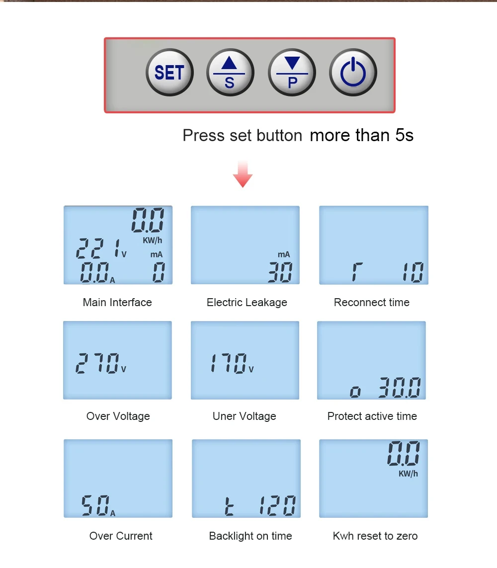 - ✅ Контроль параметров – отображение напряжения, тока, тока утечки и потребляемой электроэнергии